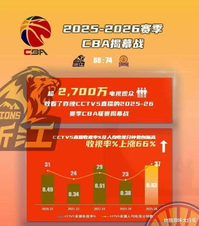 CBA揭幕战收视率暴涨,根据媒体报道数据显示,超2700万电视观众看了CBA揭幕战,直播收视率同比上涨66%。但媒体人谈CBA揭幕战收视率,认为这是虚假的。毕竟转播商和赞助商不是傻子,转播合同都成啥样了还在吹收视率。