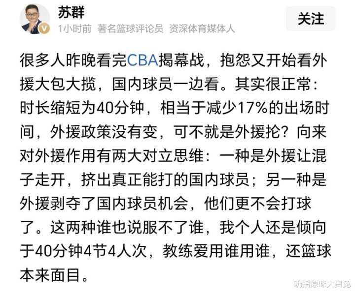 当然从揭幕战来看,外援主宰胜负?名嘴给出独特观点,苏群在社媒发文,40分钟的比赛时间,外援政策没变四节七人次,但比赛时间少了17%,可不就得是外援抡。他倾向于40分钟4节4人次,教练想用谁用谁。